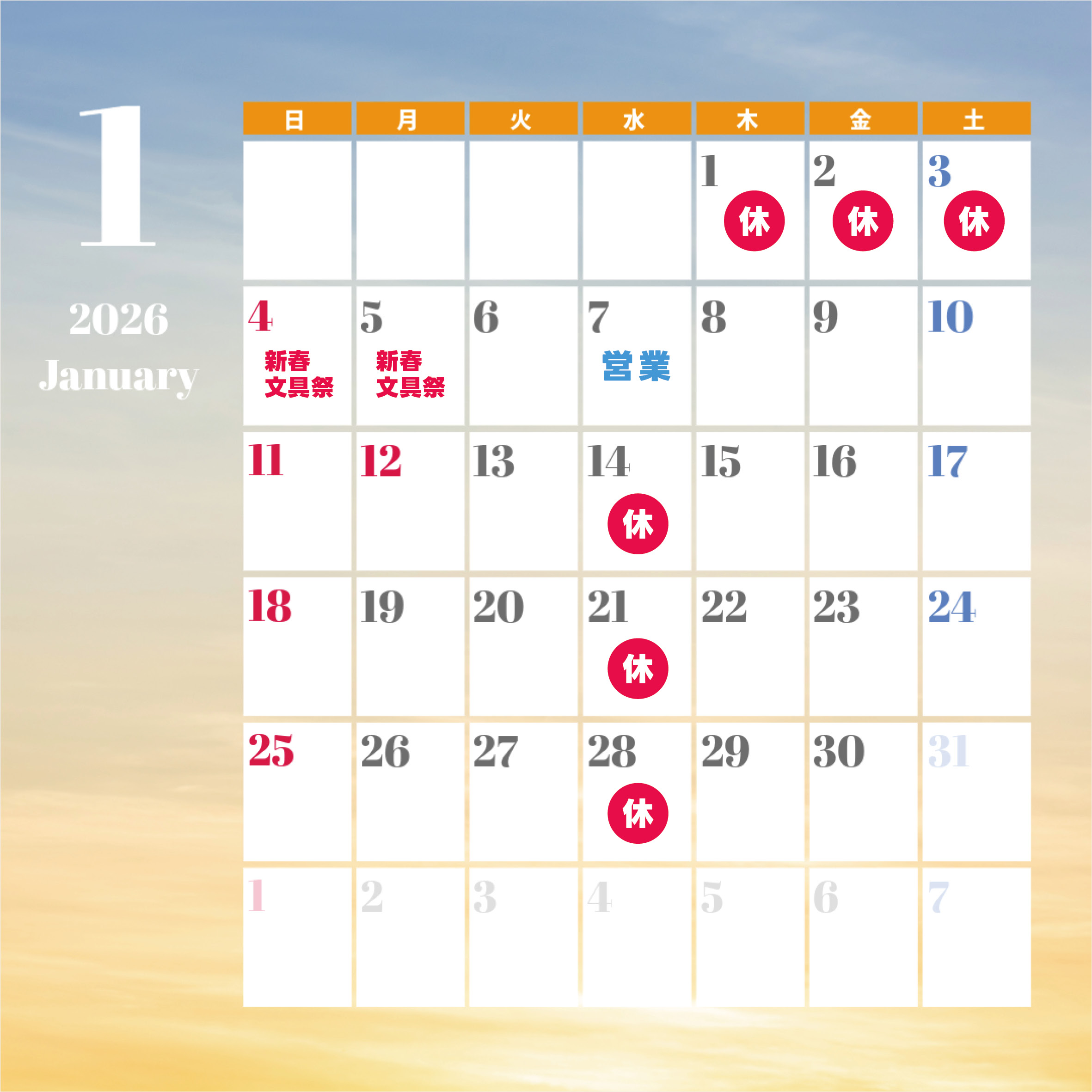 2025.12.25 お知らせ 1月の営業カレンダー こんにちは。1月の営業カレンダーです。 もうすぐ2025年が終わりますね。気象庁が2026年1月と2月の天気を予報していましたが、例年通りの寒さとのこと。 いままでが暖かいので、寒さに耐えられるか恐ろしいです。みなさまもよいお年をお迎えください。 この記事をシェアする ▶ 前へ 年末年始の営業のお知らせ