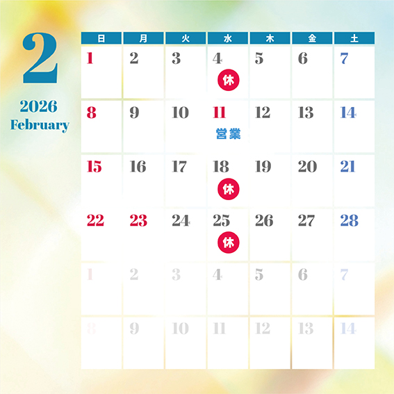 2026.01.27 営業について 2月の営業カレンダー こんにちは♪ 1月は日本海側の地域を中心に雪のところが多かったですね。益田市内はそこまで大雪にはなりませんでしたので、冬にしては比較的過ごしやすかった印象です。今回、1月中旬に商談会があり、新しい商品をいろいろと仕入れています。2月から順次入荷していくのに伴い、楽しいコーナーを企画していますのでお楽しみに♪ この記事をシェアする ▶ 前へ 1月の営業カレンダー